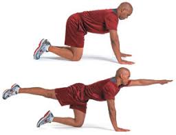Down on your hands and knees with the palms flat on the floor shoulder width apart, slowly raise and straighten the right leg and left arm at the same time. Hold the position for 7-8 second,s again breathing throughout.